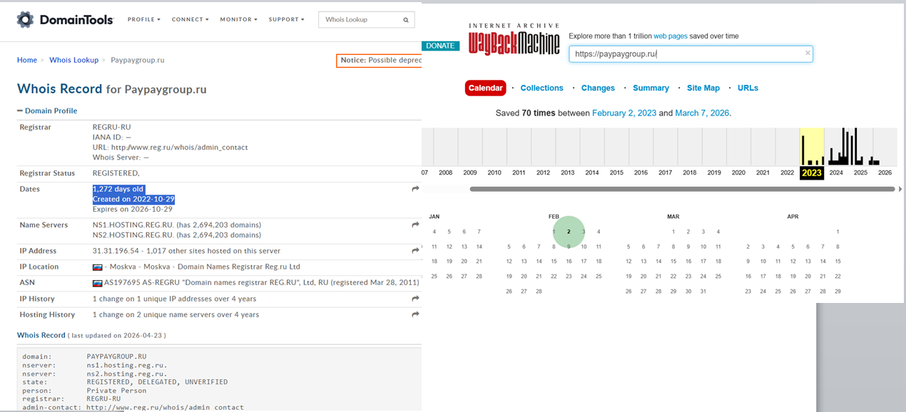 По данным карточки Whois, домен сайта Pay Pay Group ru купили в октябре 2022 года. В архивах WaybackMachine видно, что ресурс запустили в феврале 2023 года, а значит на апрель 2026 года он существует три года.