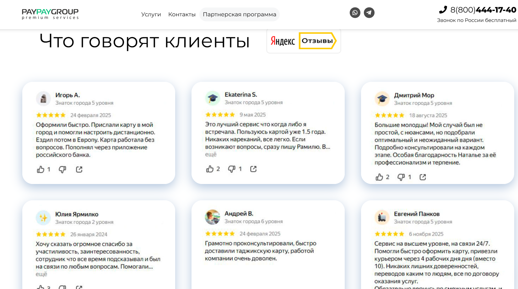 В разделе «партнерская программа» написано, что сервис помог выпустить 14 125 карт и работает с семью банками, но подтверждений нет. Связаться с менеджерами площадки можно через телеграмм-аккаунт под юзернеймом @Pay Pay Group.