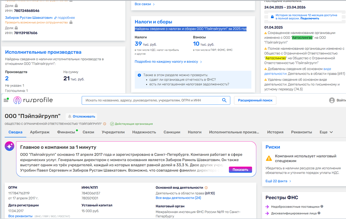 В соглашении для клиентов сказано, что сервисом управляет ООО PayPayGroup, которое зарегистрировали в апреле 2017 года. В карточке RusProfile написано, что изначально компания называлась «АатосЛингво» и работала с устными и письменными переводами. В апреле 2025 года фирма поменяла деятельность и начала заниматься «правовыми услугами».