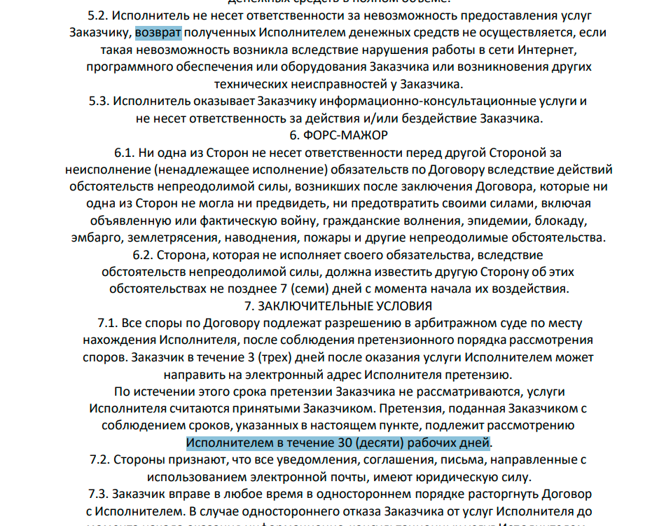 Если в течение 30 дней после оплаты клиент не передаст сервису документы, площадка расторгает договор и не возвращает деньги. На сайте сказано о «гарантии возврата», а в оферте написано, что деньги клиенту перечислят только в том случае, если услуга не была оказана по вине сервиса.