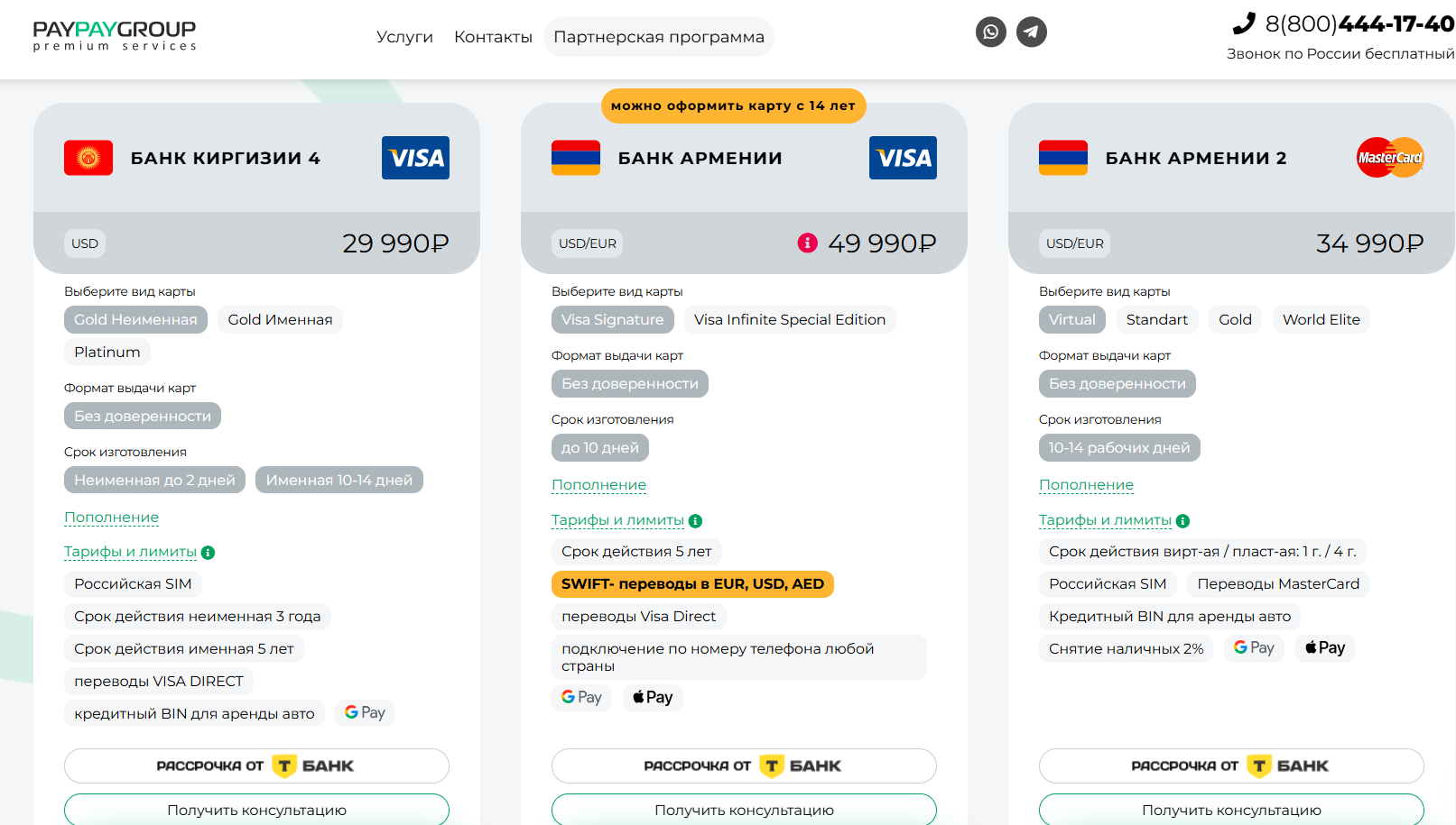Через систему PayPayCard можно заказать выпуск карты из стран СНГ, Киргизии, Армении и Казахстана. Цена пластика от ₽24,990 за неименную карту «Голд» до ₽49,990 за премиальный пластик «Виза Сигначер» и «Инфинит». Карту выпускают от одного дня до 21, а срок зависит от типа пластика, страны и условий.