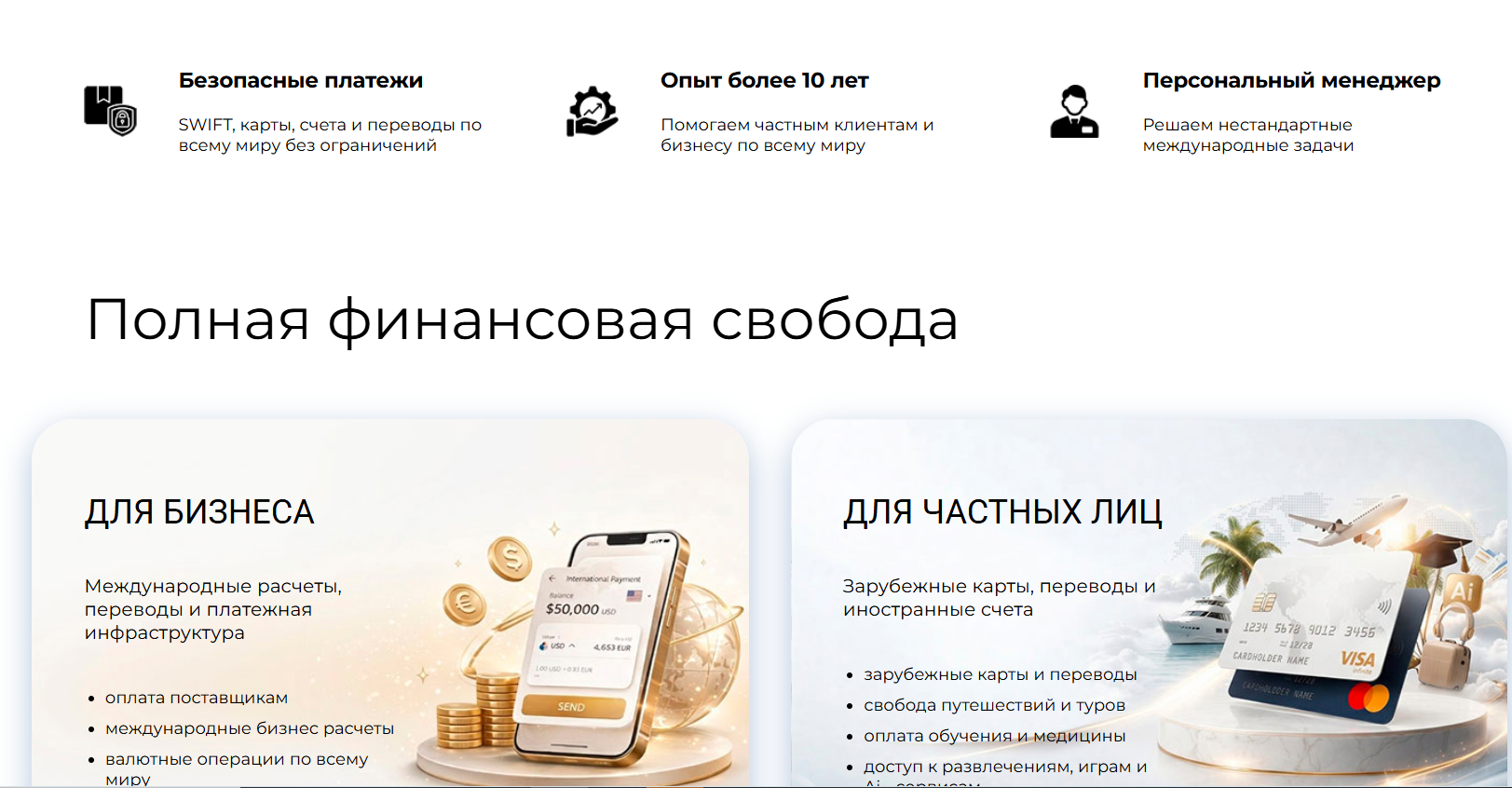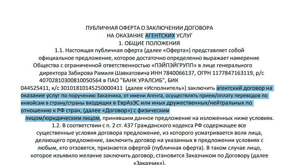 В оферте отмечено, что компания работает как агент – помогает клиенту оформлять документы и передает их в выбранную организацию, чтобы заказчик получил карту зарубежного банка. Сервис является посредником, который связывает клиента и банк. В соглашении не сказано о гарантиях и о том, что клиент получит карту, за которую заплатил.