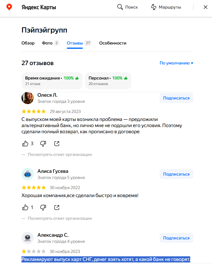 На сайте «Яндекс Карты» есть эти оценки, за исключением одной детали. Помимо положительных мнений, там встречаются и негативные отклики, о которых на площадке «ПэйПэй» не сказано.