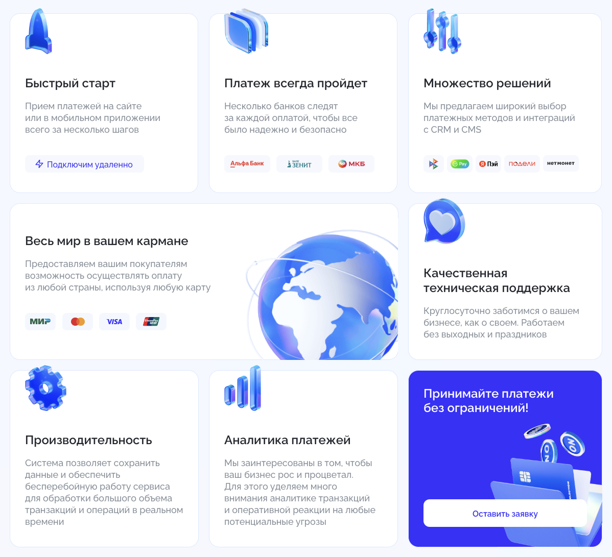 Владельцы сервиса «ПейСелекшен» обещают легкое и быстрое подключение, а также интеграцию с популярными CMS и CRM решениями. Заявлено о полной прозрачности работы.