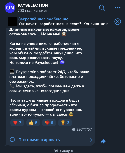 На телеграмм-канал PaySelection, на 24 января 2025-го года, подписано 700 пользователей. Публикации просматривают в среднем по 300-350 раз.