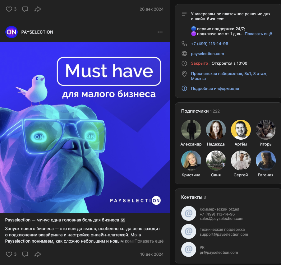 На страницу Payselection во «ВКонтакте» подписано около 1,22 тысяч человек. В комментариях нет обсуждений, а посты собирают по 2-5 лайков.