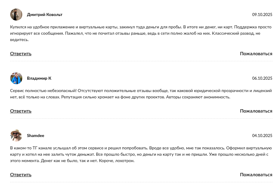 Отрицательные комментарии куда конкретнее. Люди жалуются на зависшие переводы, неработающие виртуальные карточки и молчаливый саппорт. Несколько пользователей утверждают, что после попытки вывода система «вдруг потребовала KYC» и заморозила баланс на неопределенный срок. Кто-то сравнивает проект со скамными схемами псевдо-процессингов, которые собирают депозиты под видом обменников, а потом исчезают.