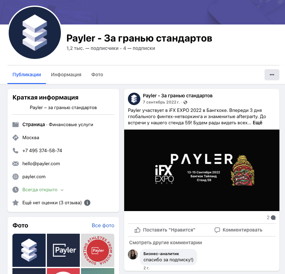 У компании существует страница на Facebook, которая называется «Payler За гранью стандартов». На нее подписаны 1,2 тысячи пользователей.