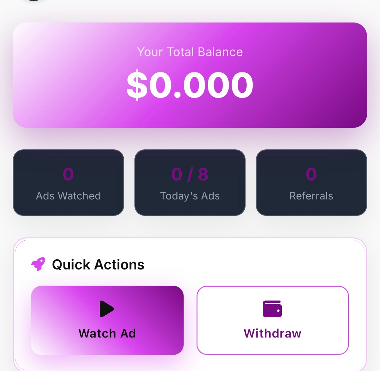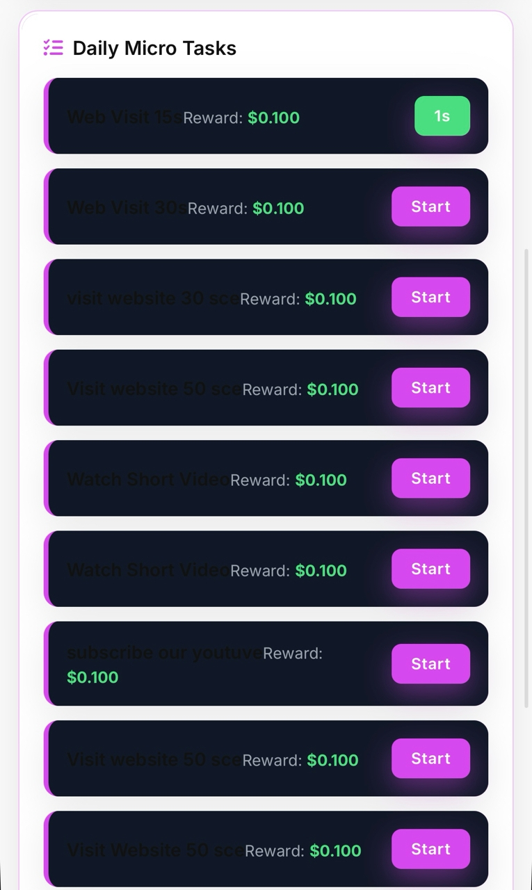 На выполнение каждого задания отводится от 10 секунд до 3 минут, обратный отсчет ведется на главном экране приложения. Здесь же отображается текущий баланс заработанных средств пользователя, количество выполненных заданий и число рефералов.