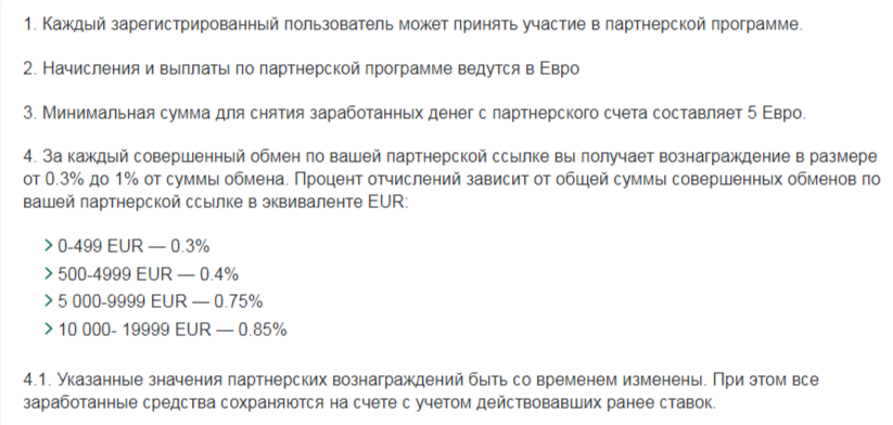 Однако, авторы расписали, какое вознаграждение пользователь может получить за участие в партнерской программе. Бонус составляет всего 0,3-1% от суммы, на которую реферал совершает обмен.