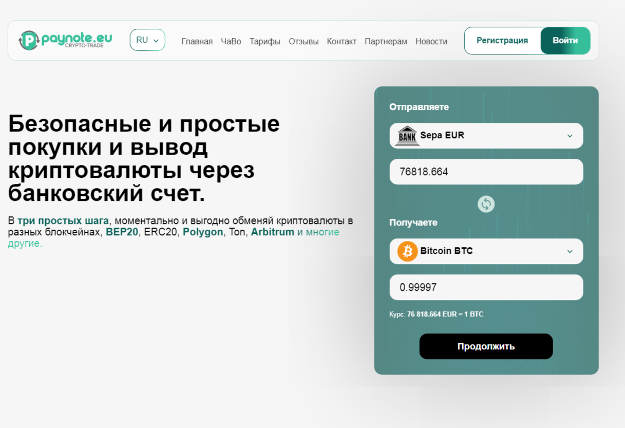 Paynote Eu – круглосуточный обменник для безопасной и простой работы. На данном сервисе можно обменивать как криптовалюты на фиаты, так и обратно.