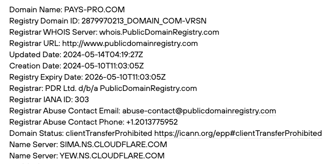 Чтобы выяснить, когда платформа «ПэйсПро» заработала, мы запросили данные домена payspro com из сервиса Whois. Выяснили, что доменное имя было зарегистрировано в середине мая 2024-го года.