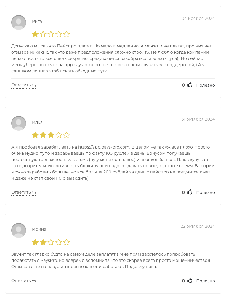 Пользователи в отзывах о сервисе Pays Pro пишут, что владельцы платформы похожи на мошенников. Люди обращают внимание на то, что в интернете практически нет информации о данной организации, а представители площадки не раскрывают своих личностей.