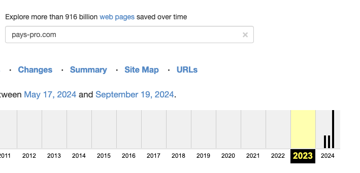 Также мы запросили снимки ресурса из сервиса WayBackMachine. С помощью них подтвердили, что сайт по рассматриваемому домену начал работу в конце весны 2024-го.