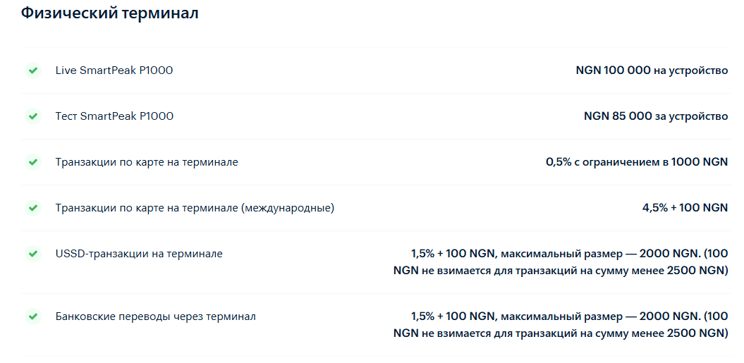PoS-терминалы продают за 100 тысяч найр в тестовом режиме. Live-версия стоит дороже. Аренда обходится в 85 тысяч найр. За транзакции через терминал списывают 0,5% с максимумом 1000 найр.