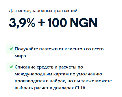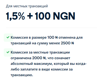 За местные платежи в Нигерии берут 1,5% плюс 100 найр. При сумме меньше 2500 найр фиксированная часть не списывается вообще. Максимальная комиссия ограничена 2000 найр за транзакцию.