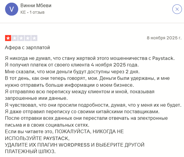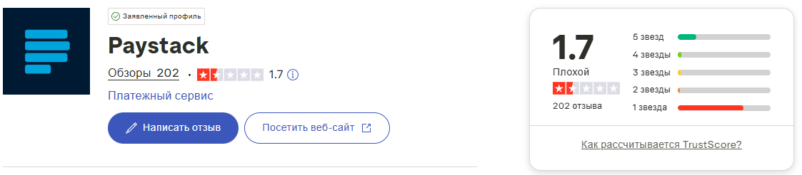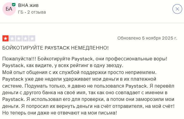 Отзывы о Paystack крайне противоречивые. На Trustpilot средняя оценка всего 1,7 из пяти при 202 отзывах. В Google картах ситуация лучше – 3,8 балла на основе более 400 мнений.