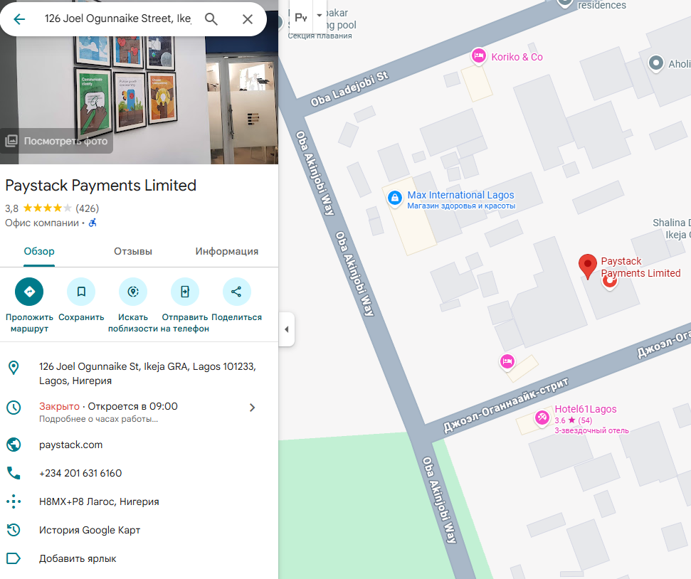 Указаны email поддержки hello paystack com и физические адреса офисов в Лагосе, Кейптауне, Аккре, Найроби и Абиджане. Есть нигерийский телефон для связи.