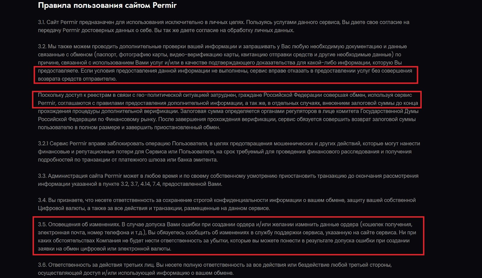 В правилах обмена все достаточно стандартно для обменника с сомнительной репутацией: могут запросить подтверждение и не вернуть деньги, если решат, что клиент не прошел проверку. Граждане из РФ обязаны внести залог из-за особенностей геополитической обстановки и дополнительно оплатить открытие платежного шлюза.В случае ошибки при вводе данных клиент несет ответственность за потерю денежных средств. Стандартный пункт, который контрастирует с описанием функционала на главной странице, где утверждается, что «система полностью автоматизирована и не проводит сделку в случае ошибок».