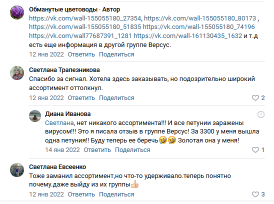 Несмотря на то, что магазин работает с 2019 года, это не мешает ему регулярно получать негативные отзывы. Главная жалоба — плохое качество рассады. Цветы приходят вялыми, с поврежденными корнями, не приживаются после пересадки. Некоторые покупатели считают, что фото в группе не совпадают с реальным товаром, а вместо здоровых черенков им отправляют больные растения.