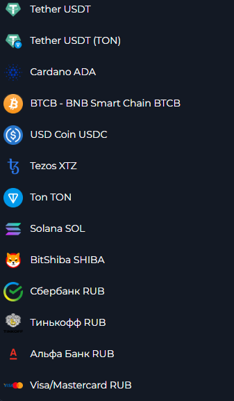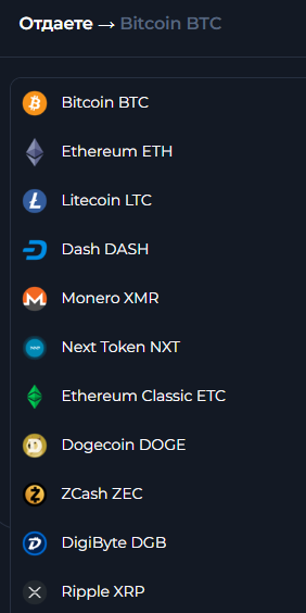 Обменные операции происходят в крипте и российских рублях. Вы можете использовать 30 направлений. Из них 26 вариантов наиболее популярных видов цифровых монет, например, ETH, XRP, BTC. И четыре версии банковских систем для обмена рублей.