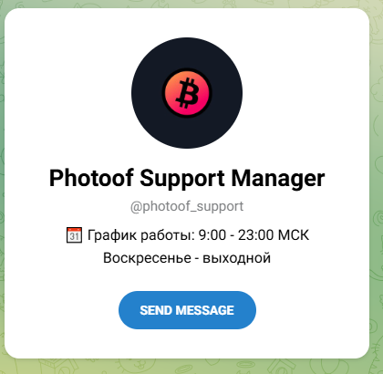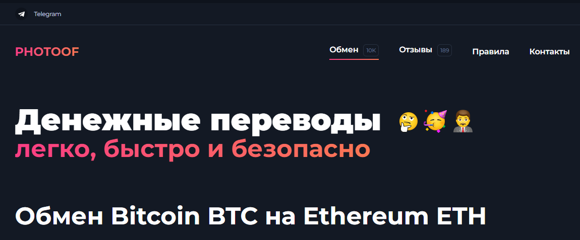 Что касается связи с оператором, то в разделе Контакты есть лишь ссылка на аккаунт Photoof Support Manager в Телеграм. Однако по какой-то причине нет номера телефона и адреса электронной почты. Что совсем нетипично – сервис даже не предлагает онлайн-чата. Такая минимальная односторонняя связь photoof support с пользователями указывает на возможность сервиса бесследно исчезнуть в любой момент. Проверенные обменники не ограничивают контакты с клиентами подобным образом.Как происходит обмен