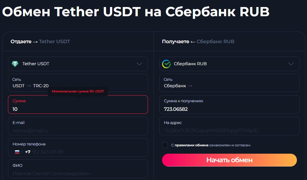 Минимальная сумма обменной операции на момент нашего обзора – 6507 RUB, что эквивалентно 79,14 USD (долларов США) или 80,24 USDT. Для сравнения, при таком лимите на других сервисах давали за 6507 RUB не более 73,9 USDT. То есть, у Протуф довольно низкий порог входа и достаточно выгодный курс конвертирования в рубли и обратно на крипторынке.