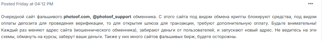 На сторонних площадках мы нашли только один комментарий о photoof com и его автор утверждает, что данный сайт – скам. Как известно, отзывы пользователей – это индикатор надежности любого проекта. Но если не брать в расчет сомнительные отклики на платформе самого обменника, то его репутация совсем не порадует потенциальных клиентов.
