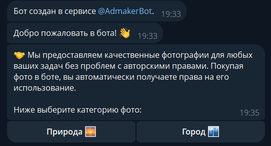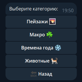 После запуска бота открывается меню, в котором можно выбрать фотографию для покупки. Они разделены на несколько категорий с подкатегориями, в каждой из которых находятся по 2-3 фото.