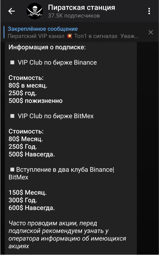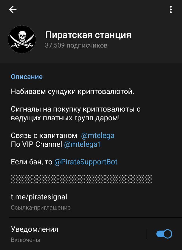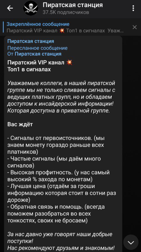 Пиратская станция – это проект в Telegram, в котором собраны сигналы из дорогостоящих ВИП подписок чуть ли не всех проектов в сети. Следует ознакомиться с данным ресурсом и выявить соответствует ли он заявленному в описании.