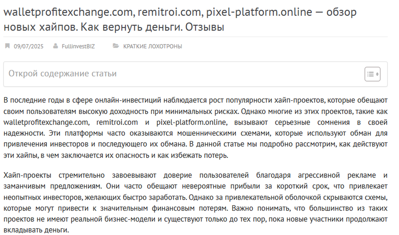 Неудивительно, что компания Pixel platform online просуществовала недолго. На момент написания обзора сайт был удален и внятной информации о хайпе в сети практически нет.
