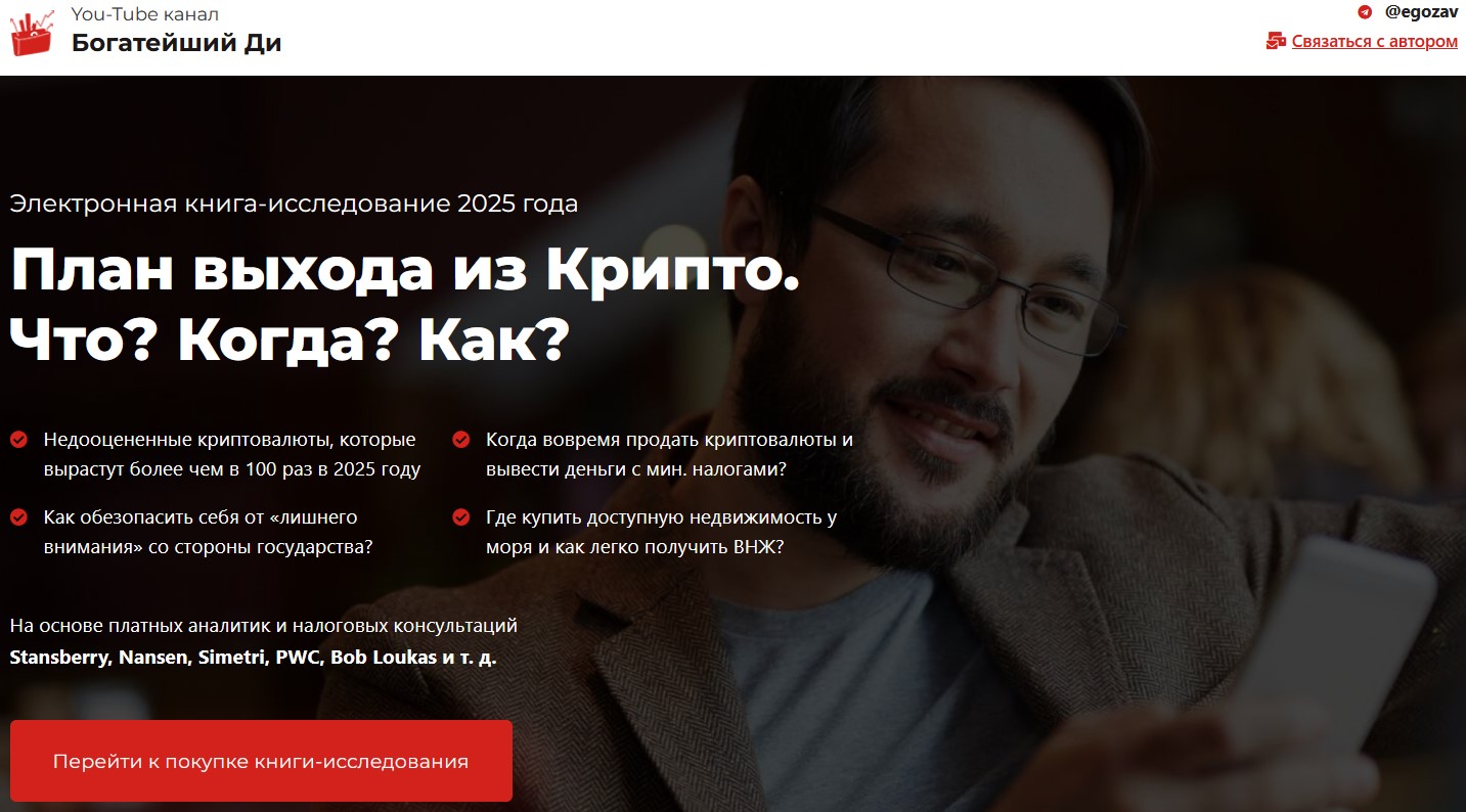 План выхода из Крипто Что Когда Как — электронная книга о криптовалюте от Ютуб-блогера Богатейший Ди. В ней он расписал свое видение криптовалютного рынка на 2025 год и пообещал инвестиционные идеи для максимальной прибыли. Рассмотрим проект План выхода из Крипто Что Когда Как и проверим, насколько честен его автор с читателями.