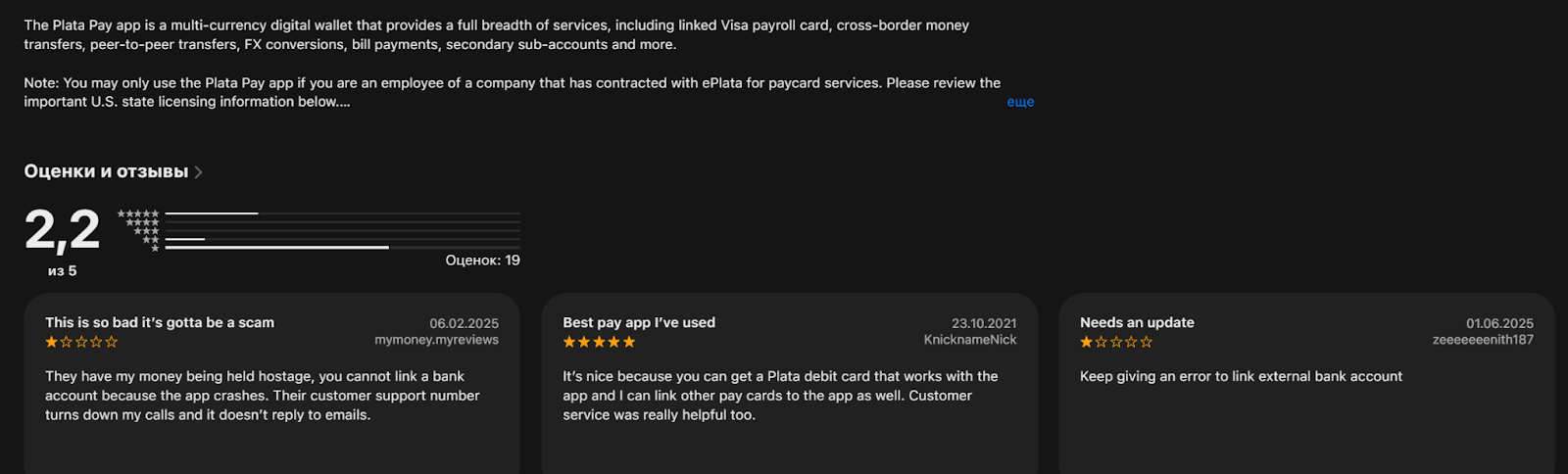 Отзывов о PlataPay очень мало. Рейтинг приложения низкий, из 4 отзывов — 2 негативных. Пользователи сообщают о проблемах с выводом средств, так как приложение постоянно крашится, а поддержка не может или не хочет решать вопросы. В личном кабинете деньги отображаются, но для снятия нужно вставить ссылку на банк, в этот момент выскакивает ошибка, операцию нужно начинать сначала. Процесс может длится бесконечно, так как разработчики не устраняют баги.