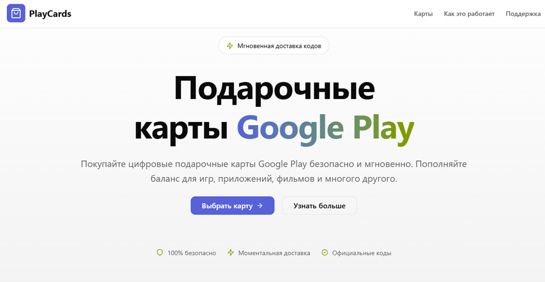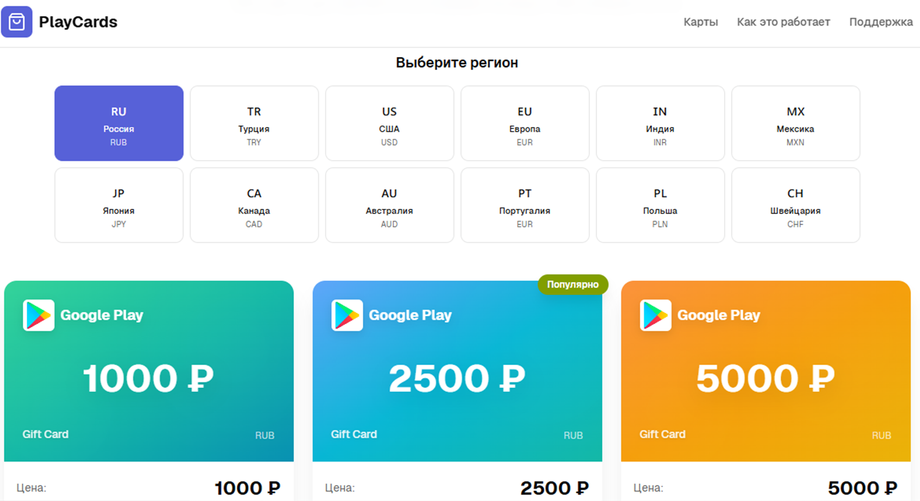 На сайте Playcards 24 клиенты сервиса могут выбрать одну из подарочных карт для оплаты Google Play. Минимальный номинал – 1000 рублей, максимальный 10 000 рублей.