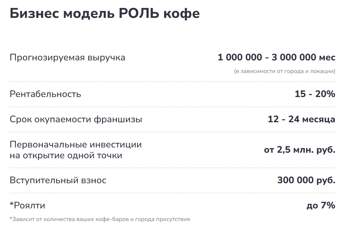 Франшиза «РОЛЬ Кофе» – это готовое решение для тех, кто хочет войти в ресторанный бизнес. Авторы проекта говорят о быстрой окупаемости и минимальных рисках. Чтобы открыть собственную точку, нужно будет вложить от 2,5 до 4,5 млн рублей, чтобы арендовать помещение, закупить оборудование, оформить интерьер и пр.Что касается франшизы, то вступительный взнос составляет 300 тысяч рублей, роялти – до 7%. Но авторы проекта обещают, что вложения быстро окупятся, ведь прибыль прогнозируется на уровне порядка 2 млн в месяц, а рентабельность составит около 20%. Но это все лишь прогнозы.