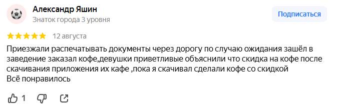 - по мнению людей, кофе вкусный, цены приемлемые, есть бонусы и скидки, но заведения перегружены в часы пик, и иногда отсутствует выбранный напиток;