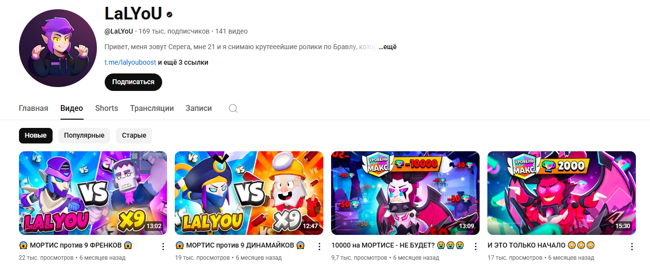 LaLYoU — Youtube-канал с роликами по Brawl Stars. Его вел молодой блогер Сергей, который зарабатывал на детской аудитории. Потом он продал свой канал и решил пытаться монетизировать Telegram.
