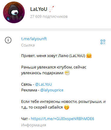 LaLYoU — коммерческий Telegram канал о подарках. Автор выбрал самый дешевый способ набора аудитории. Он может постить что угодно, только время от времени проводя розыгрыши, и у него все равно будет больше 20 000 подписчиков. Покупать рекламу у такого блогера бесполезно.