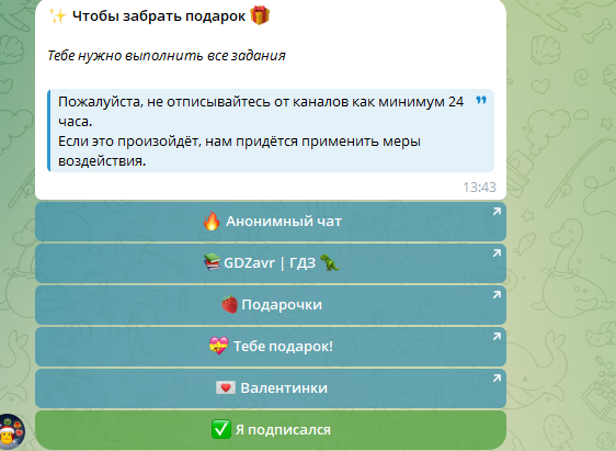 - Нет гарантий, что после подписки на каналы пользователь действительно получит подарки.