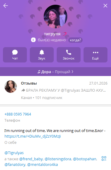 В описании аккаунта есть ссылка на отзывы о размещенной с помощью этого человека рекламе, но у этого канала всего 272 подписчика. Все это также косвенно говорит о накрутке, так как ни этот пользователь, ни его другие проекты неизвестны аудитории.