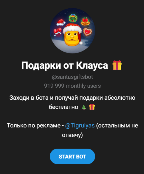 Предположительно, телеграм-бот «Подарки от Клауса» появился в декабре 2025 года, так как именно с этого момента о нем появились первые упоминания в сети. Заявлено, что платформой ежемесячно открывает около 919 000 человек – это колоссальная цифра, даже для приложения с бесплатными подарками.