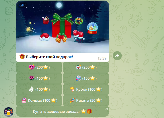 В реальности все работает немного иначе: пользователь действительно может кликнуть на любой подарок, рядом с опциями в меню указана его примерная стоимость в звездах «Телеграмма». Например, мы попытались получить NFT за 200 Stars, что оценивается примерно в ₽300 в начале 2026 года.