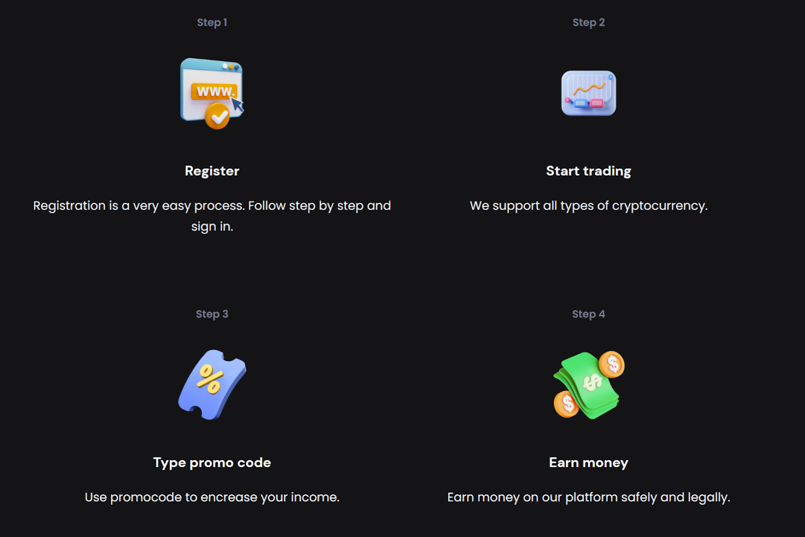 Для запуска торговли нужно зарегистрироваться на Pointpai. После внесения денег на счет можно работать с разными видами крипты и применять промокод для повышения прибыли. Какой-то другой конкретики по этому вопросу нет.