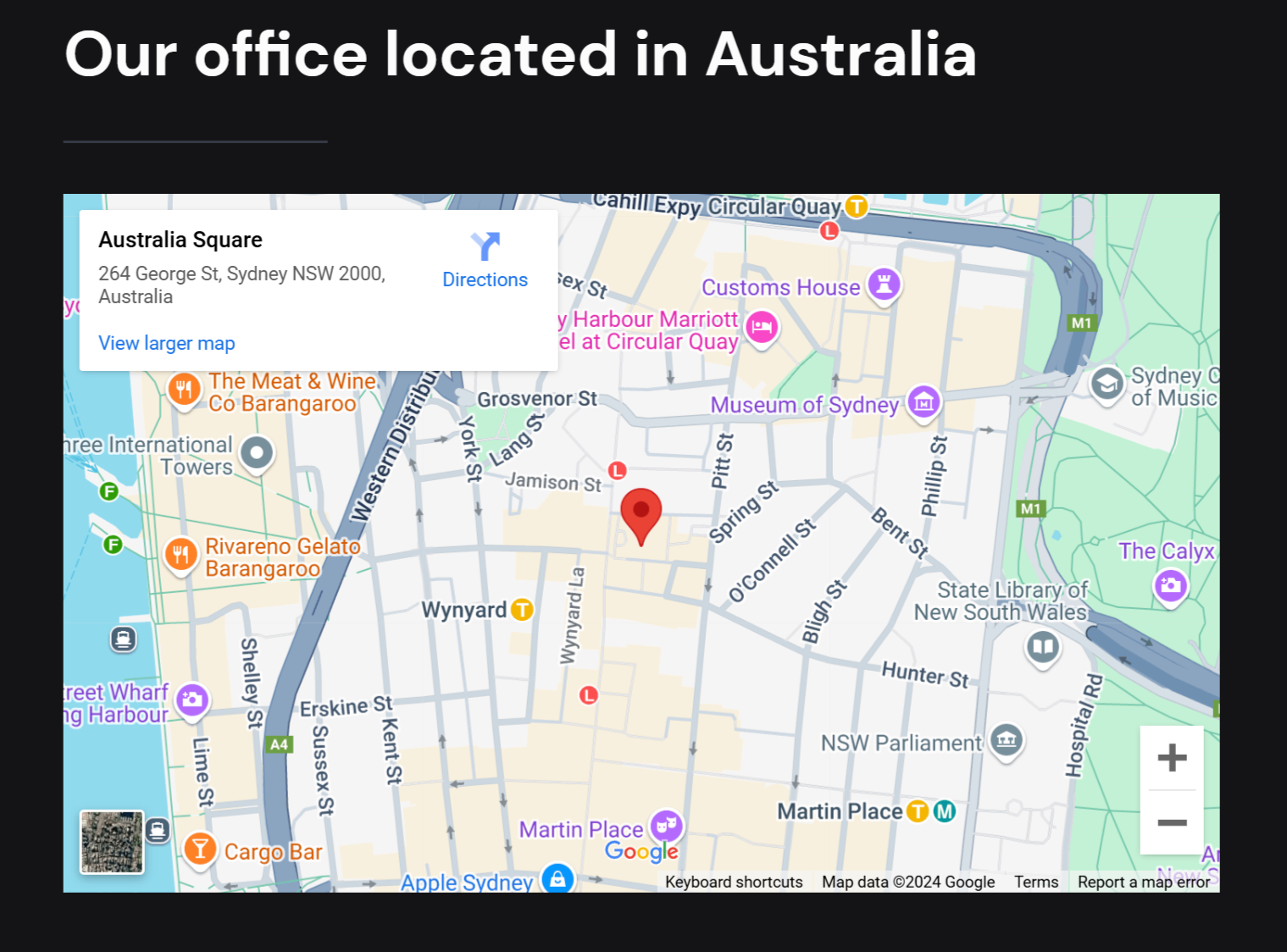 Офис Pointpai расположен в Австралии по адресу Св. Георг, 264. В разделе лицензий говорится, что компания зарегистрирована в качестве организации по обслуживанию иностранных денег. В Европе она имеет разрешение от управления финрегулирования и надзора. Также компания хвастается регулированием со стороны уполномоченных органов других стран. Правда, такие заявления — просто слова, не имеющие подтверждения в виде сканов лицензий или иных документов.