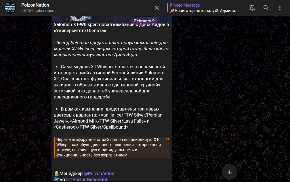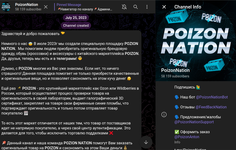 В описании сообщества как таковой ценной информации о маркетплейсе Poizon Nation нет, кроме контактов техподдержки — PoizonNationSupport, бота и треда в фидбеками от якобы клиентов. Старт проекта был 25 июля в 2023 году. Во вступительном посту Антон рассказал, что канал — прям целая площадка, при помощи которой пользователи могут покупать дефицитные товары по большим скидкам.