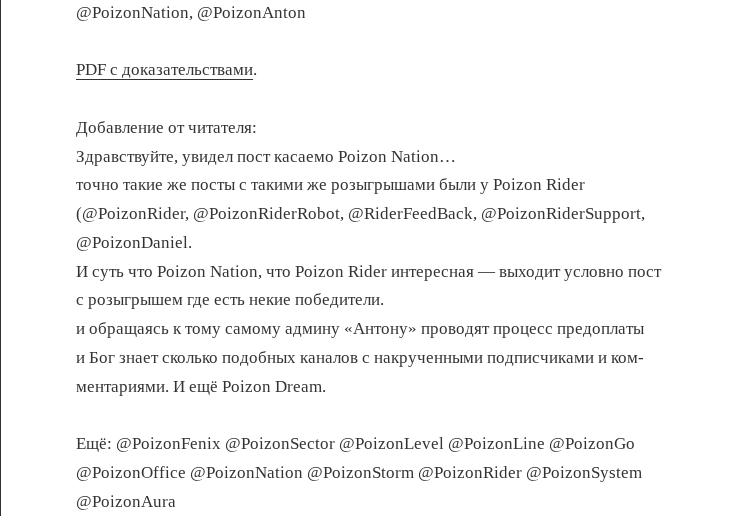 - Проекта нет ни на одном форуме в сети. Это говорит только об одном — маркетплейс специально скрыт от аудитории вне рамок телеграма, чтобы потом не отбиваться от жалоб на обман PoizonNation.