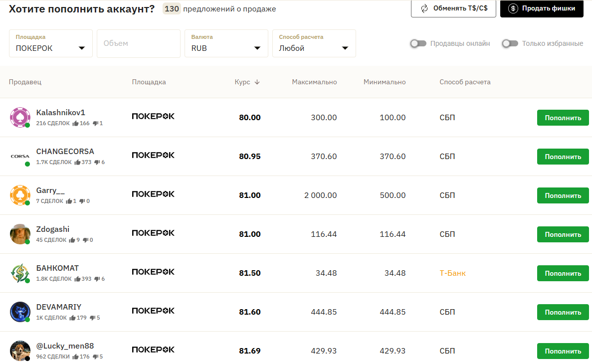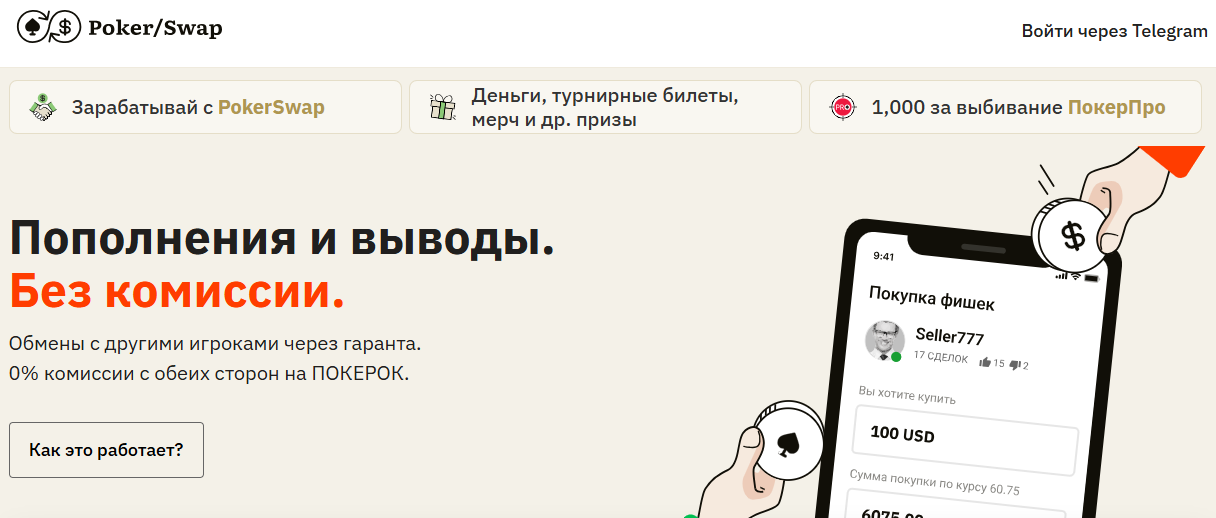 Обменник Poker Swap (Покер Свап) представляет собой P2P-сервис, на котором пользователи могут пополнить баланс в рублях, купив внутреннюю валюту у других клиентов или снять деньги, продав свои фишки. Он преподносится как способ обойти ограничения на операции с российскими картами.