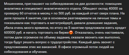 В отзывах о работе помощником трейдинг аналитика люди называют это разводом. Один из пользователей, например, пишет, что после прохождения обучения ему предложили взять кредит в 600 тыс. рублей и очень на этом настаивали.