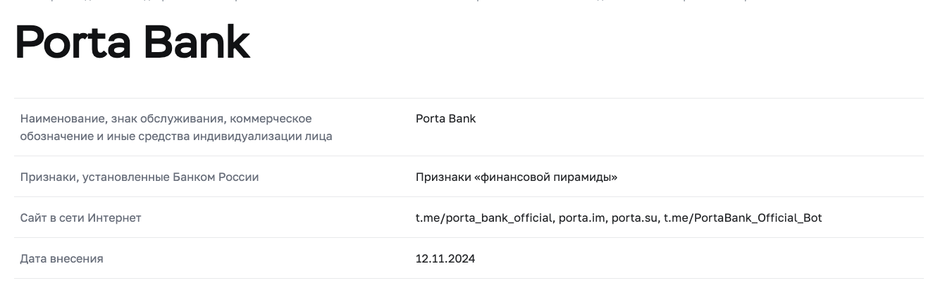 Официальное описание продукта выглядит солидно. Но есть одна большая проблема. У «Порта Банк» нет лицензии. Более того, ЦБ РФ нашел у рассматриваемой системы признаки финансовой пирамиды.