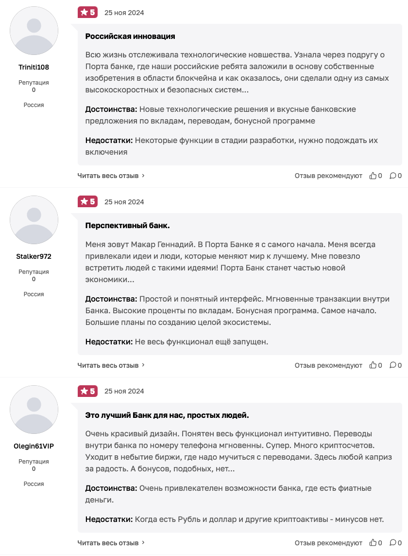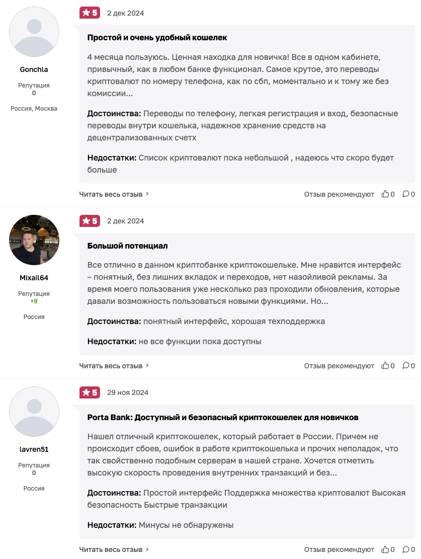 Люди хвалят криптокошелек Porta Bank за удобство переводов, широкий набор функций и инновации. Некоторые пользователи утверждают, что Porta – это банк будущего.